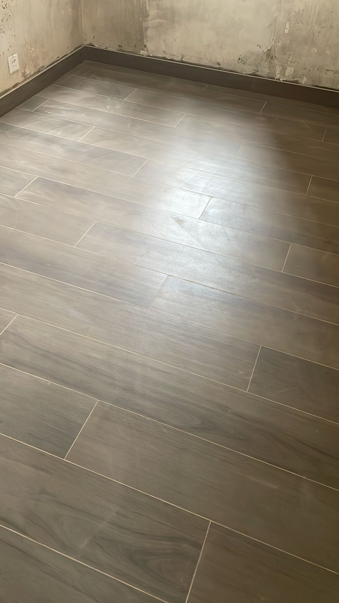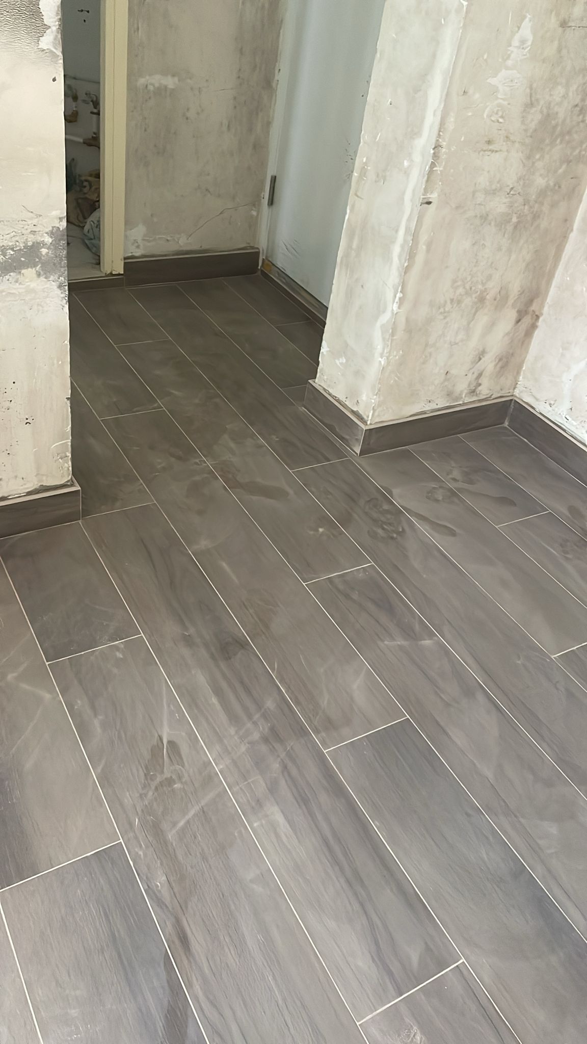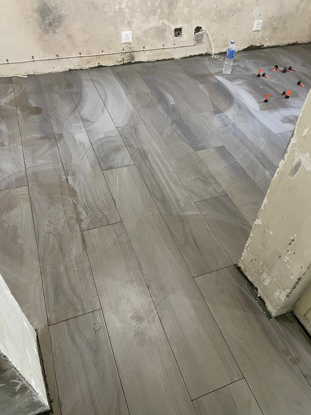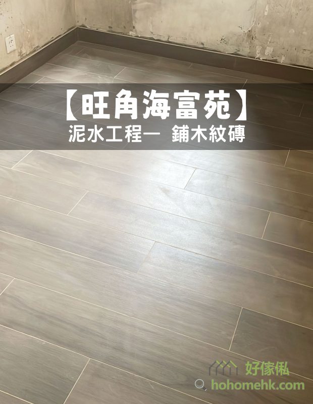 旺角海富苑泥水工程— 客廳及房間鋪木紋磚 (亂工鋪)!木紋磚防水防潮,容易打理及清潔,使用壽命都比木地板及石塑地板長。