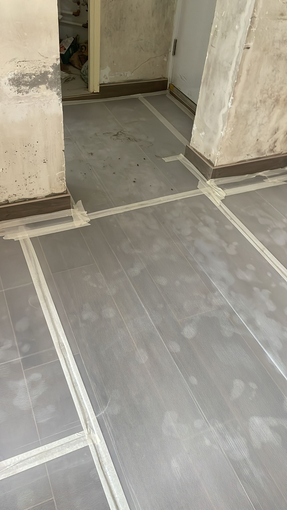 旺角海富苑泥水工程— 客廳及房間鋪木紋磚 (亂工鋪)!鋪好地磚之後做好保護,就不怕進行其他工程或者安裝傢俬時會刮花地板。