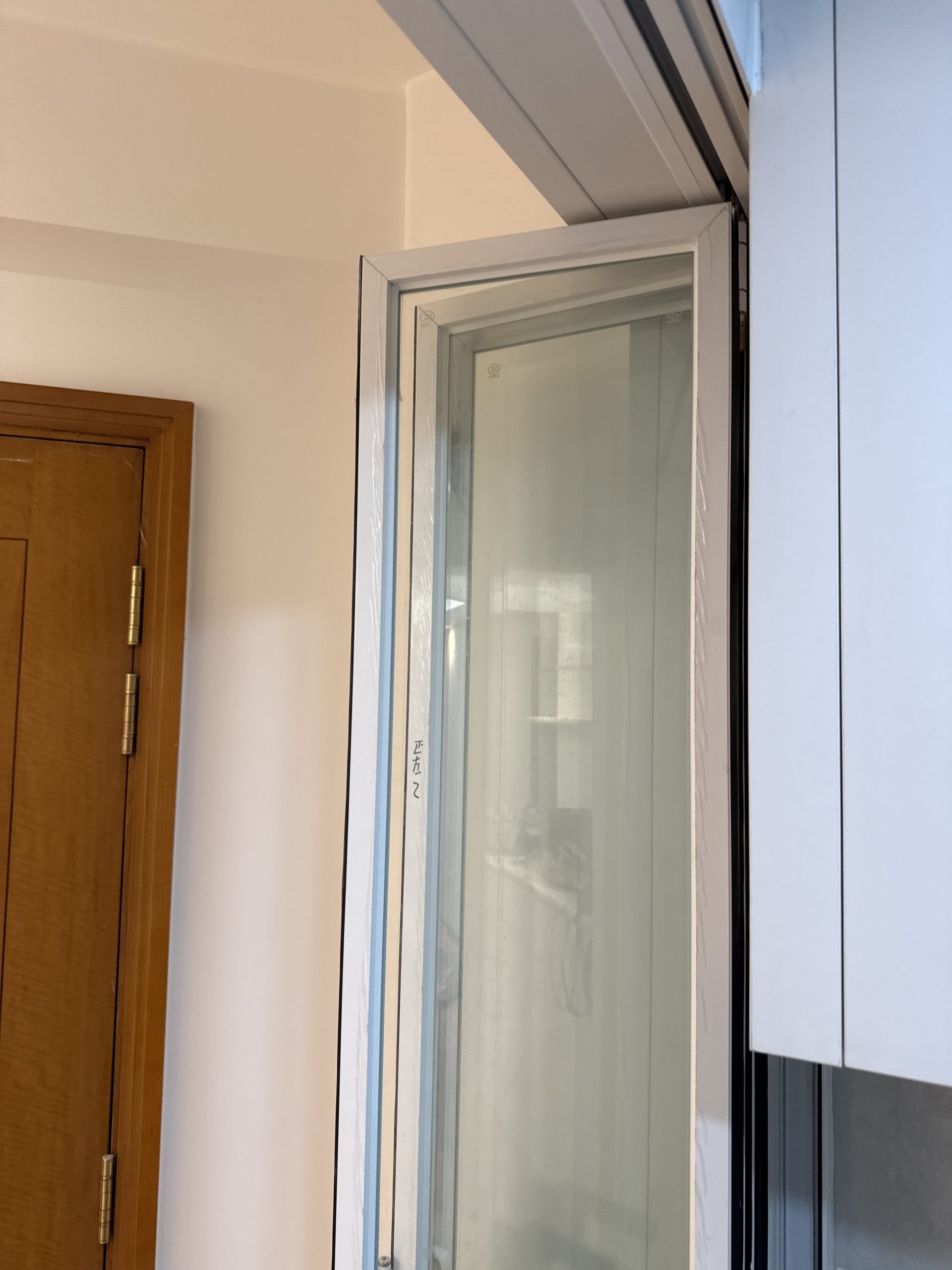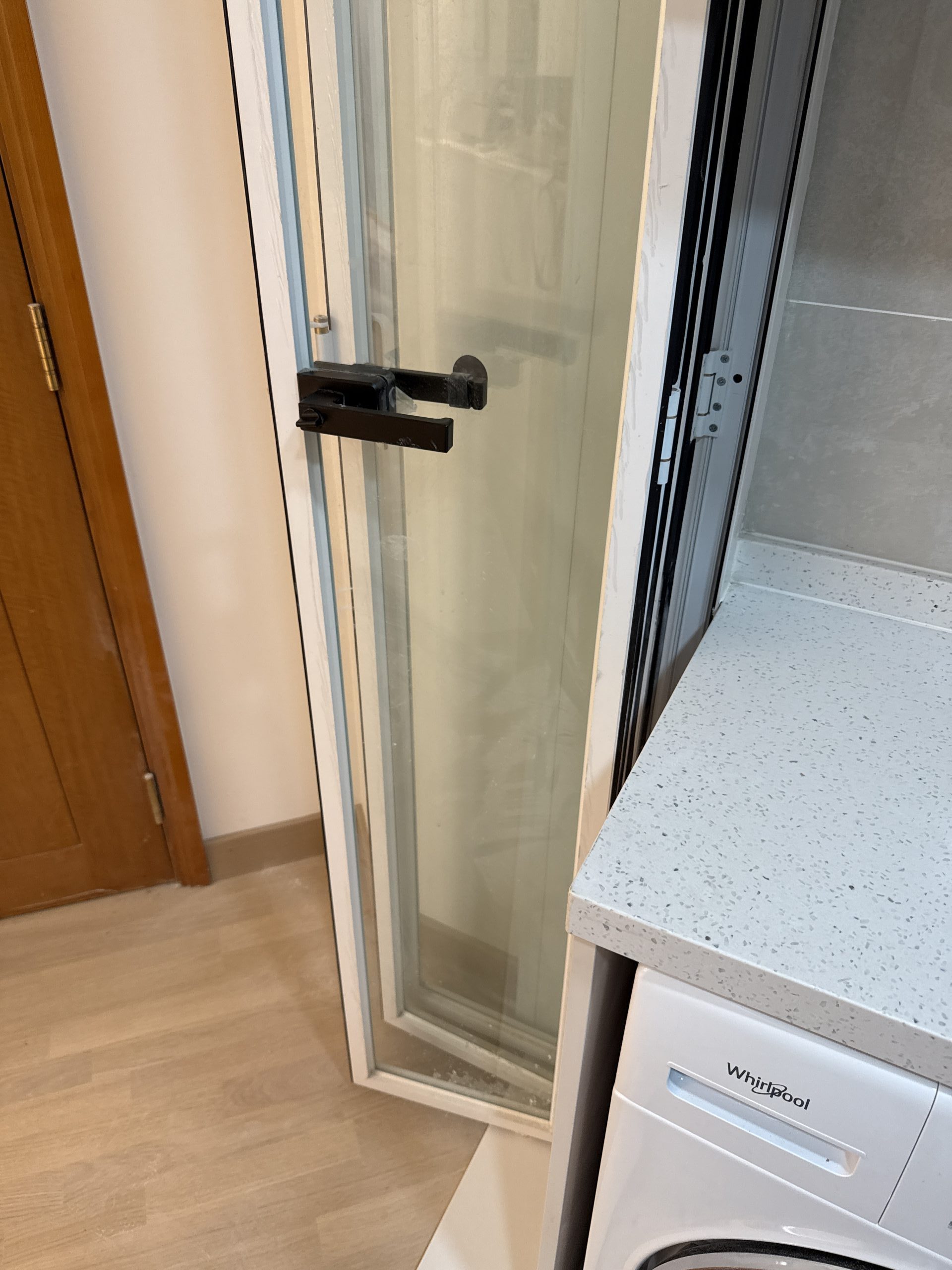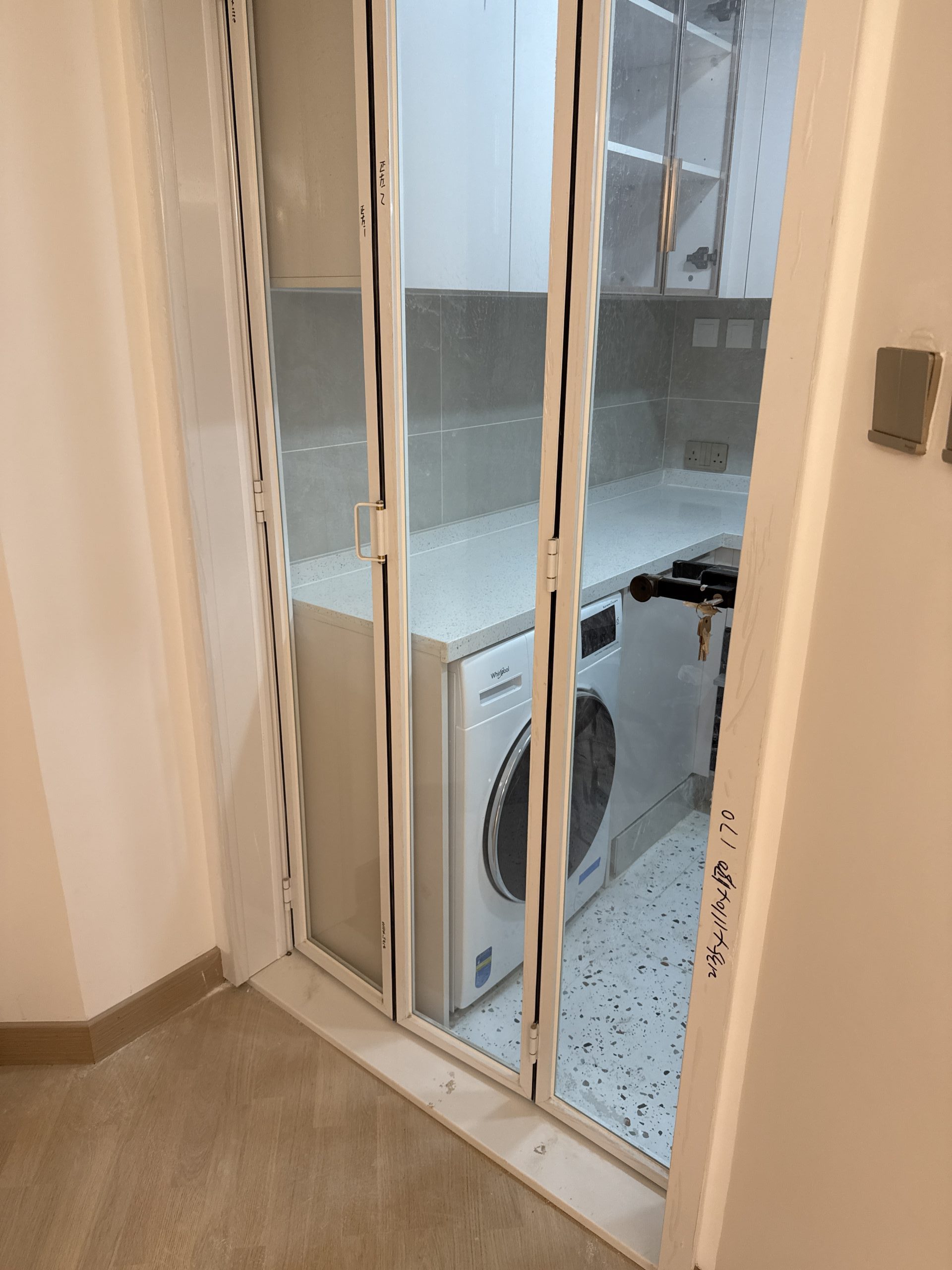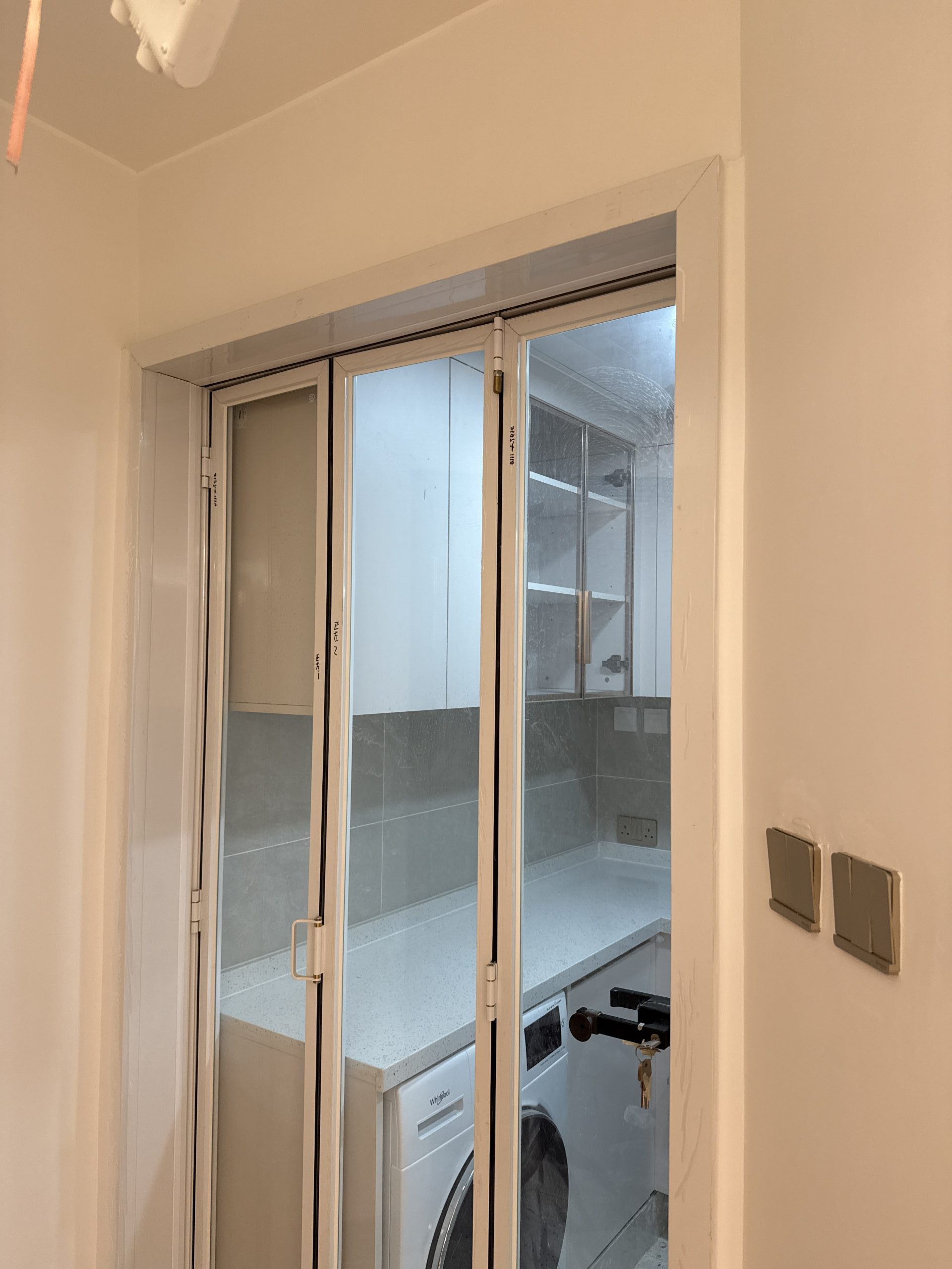 廚房門訂造了3摺門,清玻配白框,與淺色廚櫃非常match!摺門可以預留較大的出入通道,日後要更換洗衣機及雪櫃都比較方便。