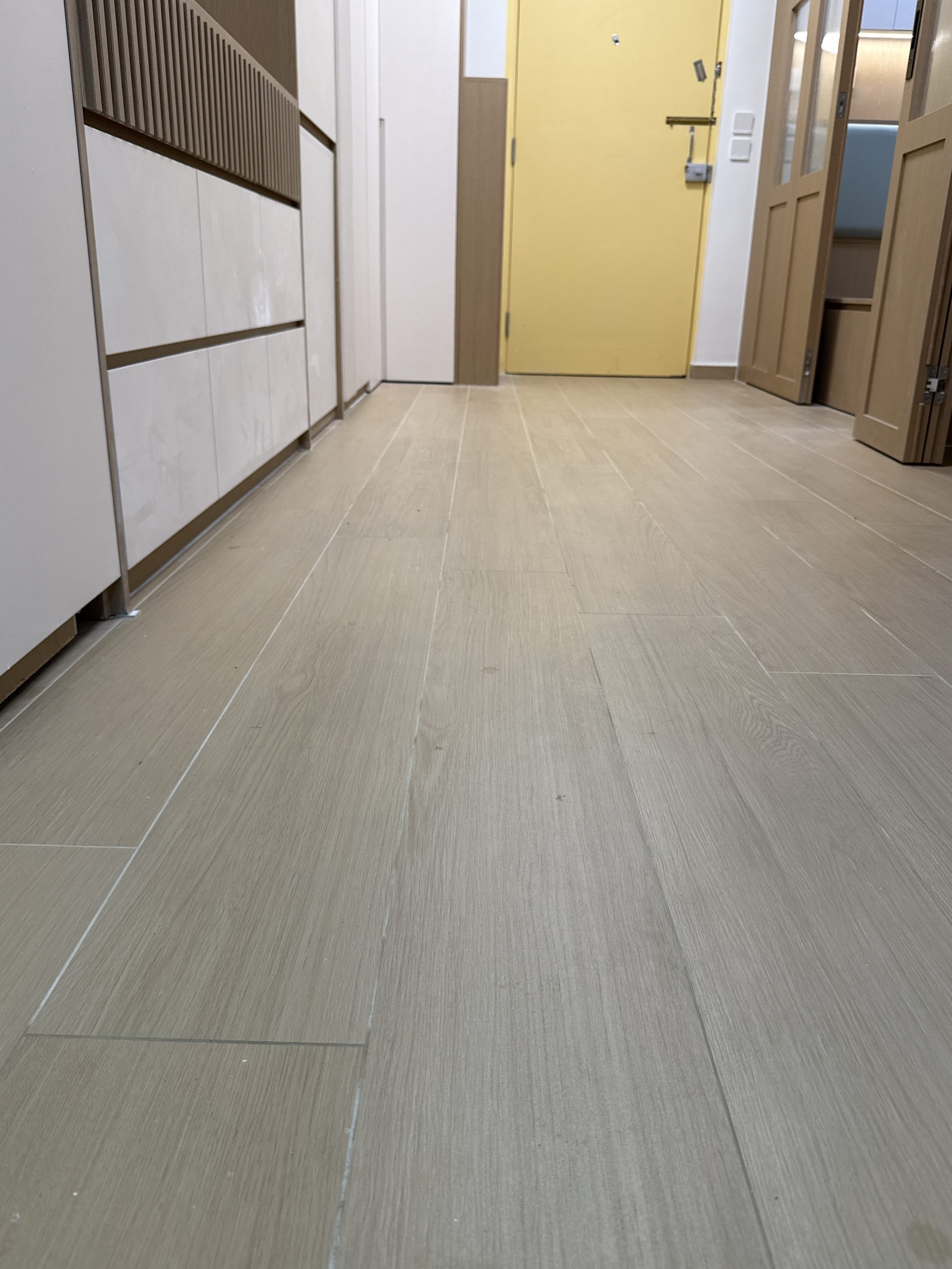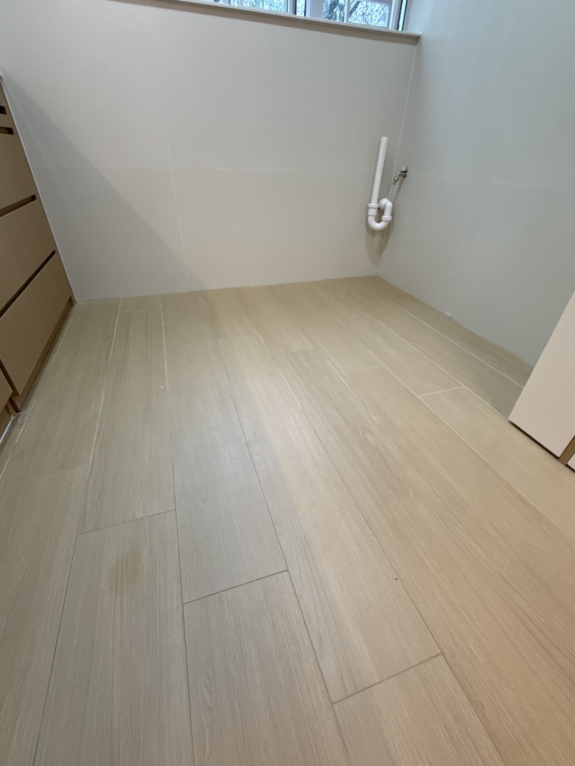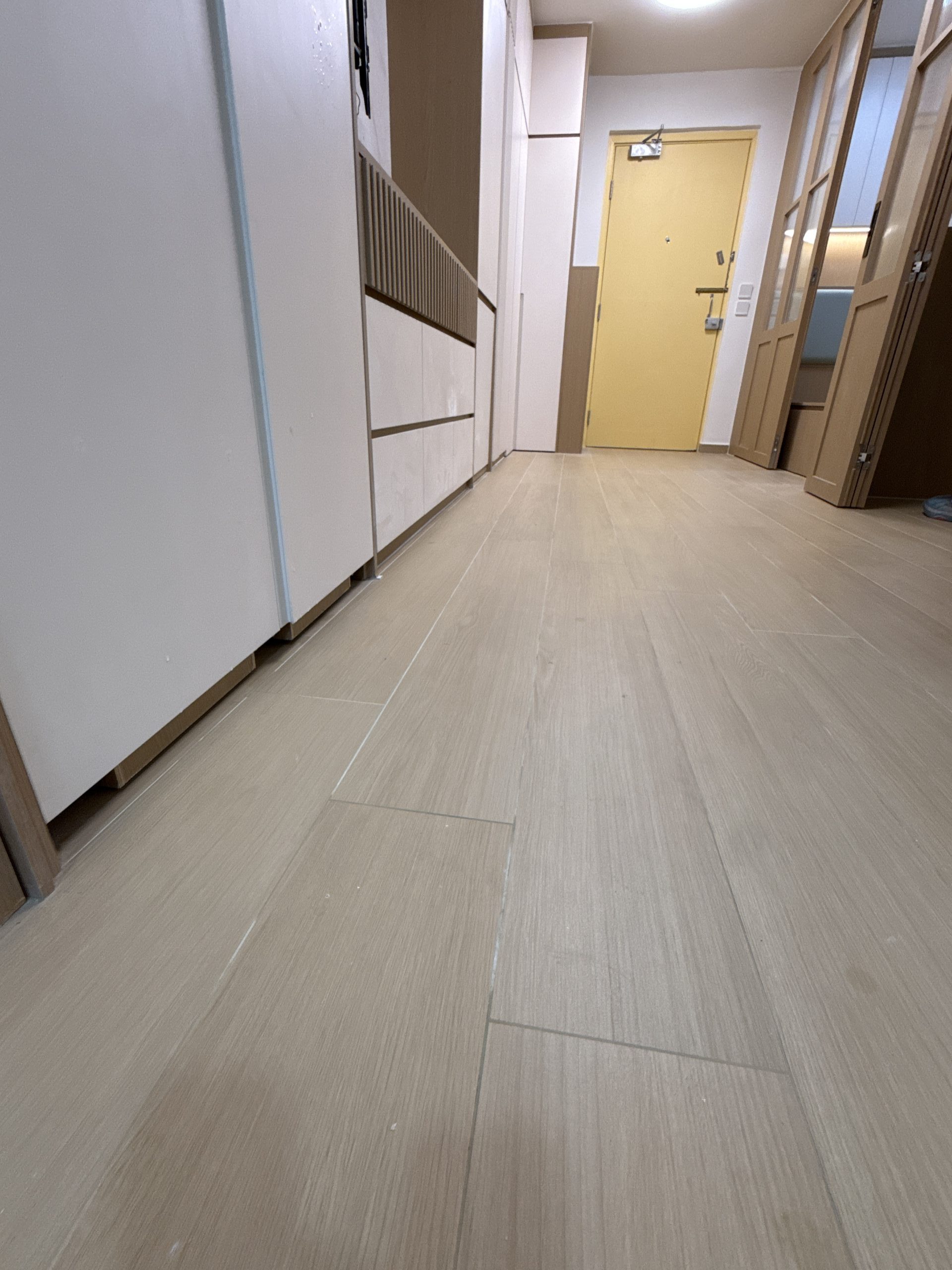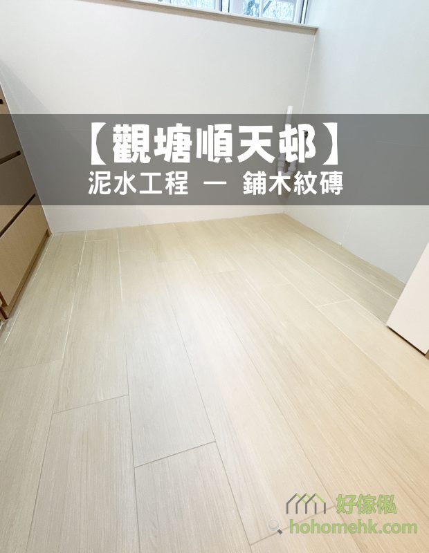 觀塘順天邨泥水工程— 客廳及房間鋪木紋磚 (亂工鋪)!木紋磚防水防潮,容易打理及清潔,使用壽命都比木地板及石塑地板長。
