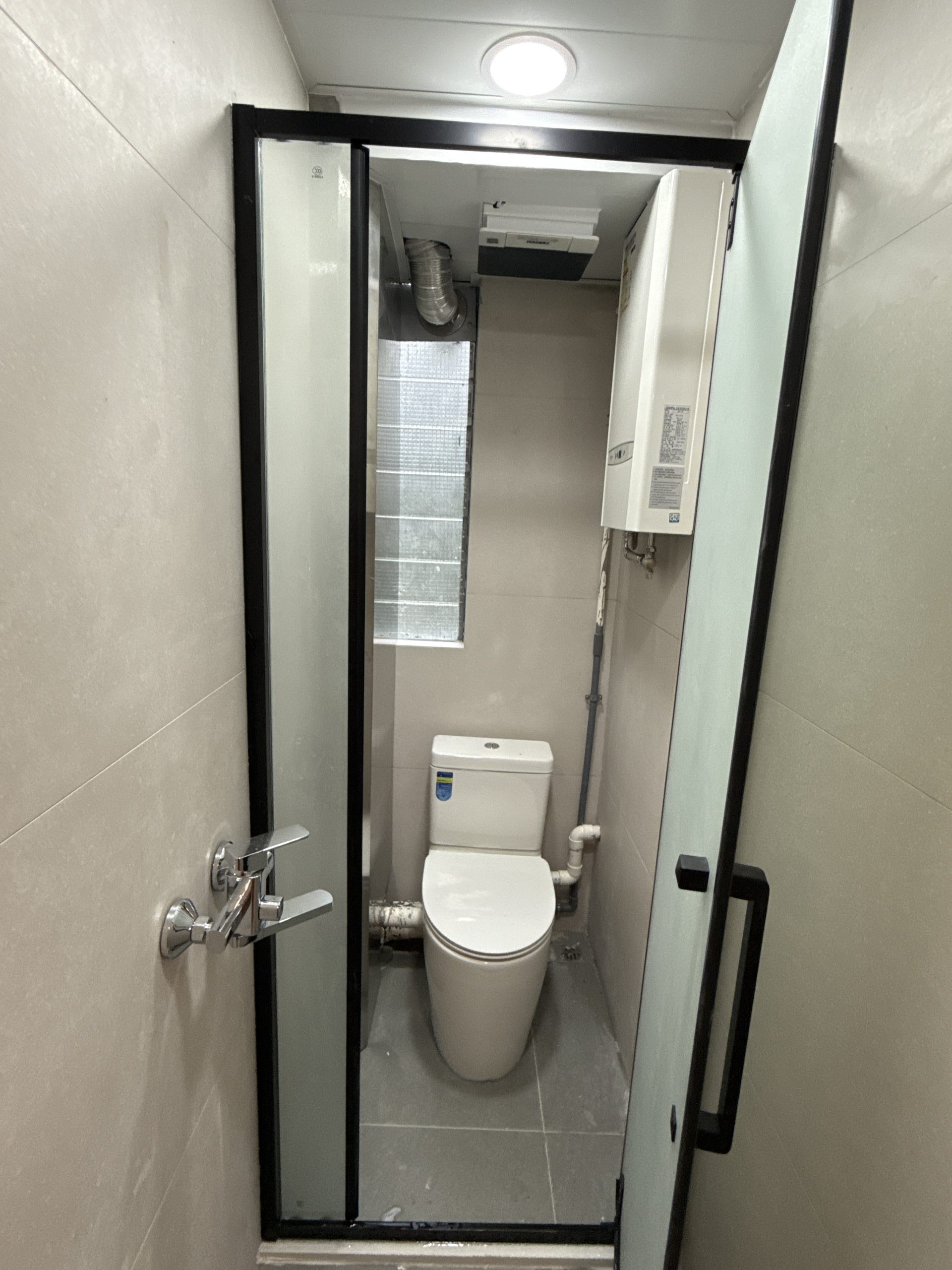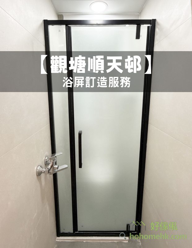 觀塘順天邨浴屏訂造服務 (不銹鋼框,啞黑,單開門,配磨砂玻璃),包送貨及安裝,可升級清拆及棄置舊浴屏選項。單開門浴屏款式,非常慳位,公屋廁所都可以做到乾濕分離,提升生活質素。