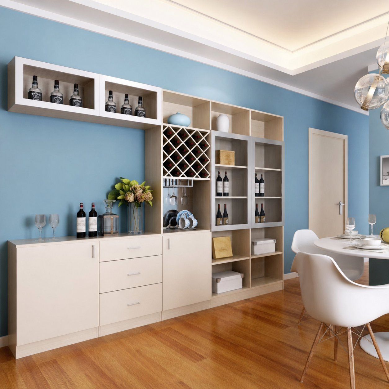 旁邊的C字櫃,有著非常多的功能,包括酒櫃、儲物櫃和餐邊櫃,意想不到的是還隱藏了一張1米3的伸縮餐枱!對於小型單位來說,客飯廳要找位置放一張餐枱並不容易,如果要兼容餐枱的空間可能就要捨棄儲物櫃,所以我們就為客人訂造一張可以收納在C字櫃的伸縮餐枱,開飯時只要翻開面板就可以拉出大餐枱,非常容易操作,小朋友都可以幫手開枱。除了地台箱座位外,我們還在C字櫃預留了一格用來放圓櫈或摺疊式餐椅,多幾個親友過來食飯都可以坐得舒舒服服啦。C字櫃的中空位置用來放水壺、杯、生果盆、零食就適合不過啦,平時使用起來很就手,又不用佔用廚房的空間。