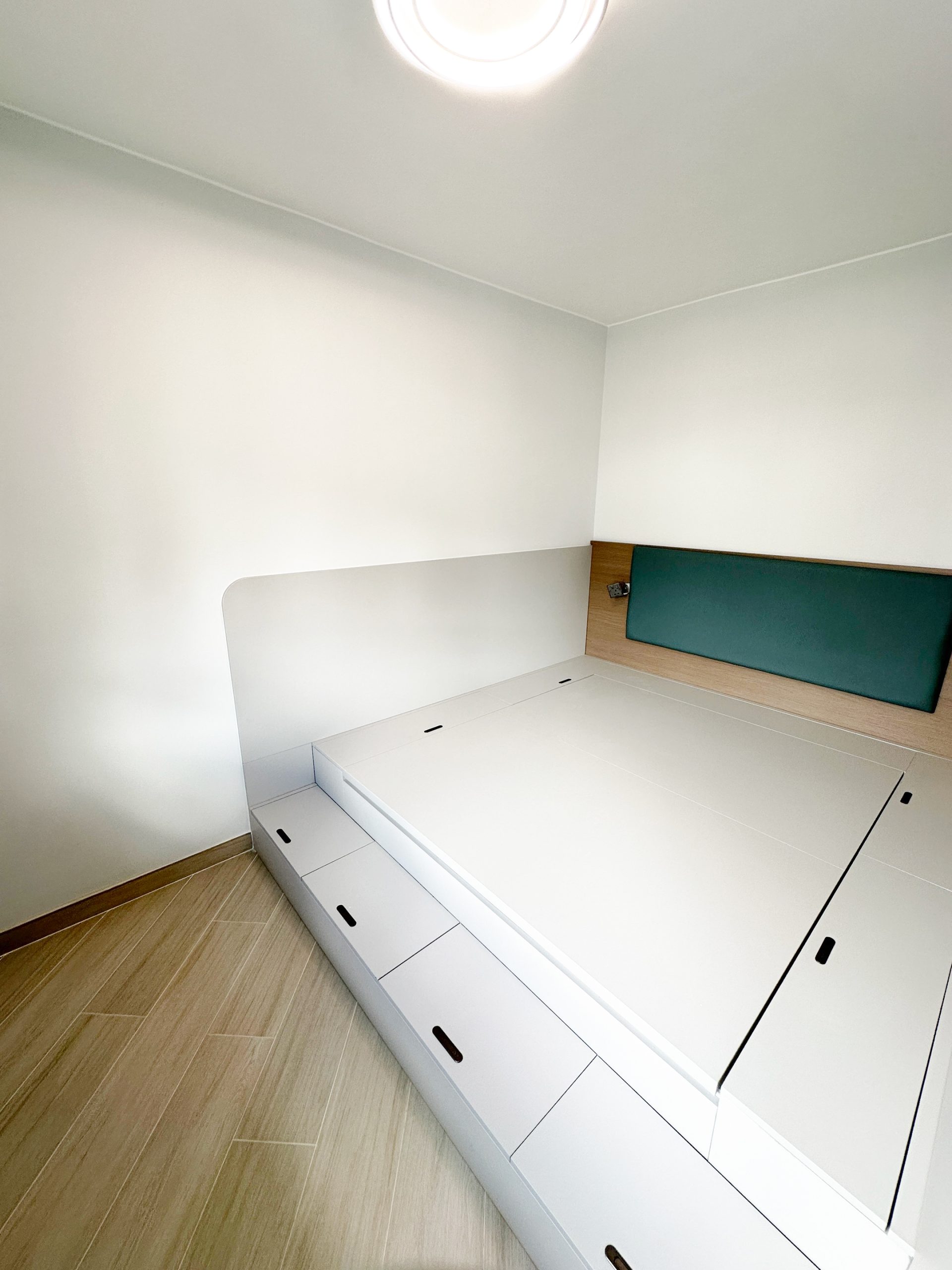 進入主人房,首先吸引目光的是大容量油壓床。床板下方擁有充裕的儲物空間,適合存放大型床品和季節性物品。而床頭的內嵌式設計,配合燈效,夜間使用更添溫馨。