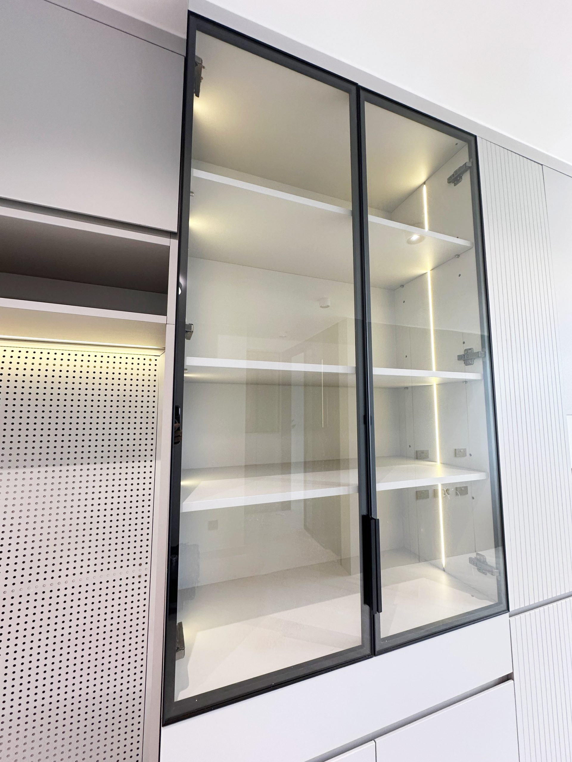客廳櫃內結合了一組玻璃飾櫃,既適合擺放裝飾品,又賦予整體空間輕盈感。櫃內的內置燈帶進一步凸顯展示效果,令空間更富有層次感,實現了美觀與實用的雙贏。