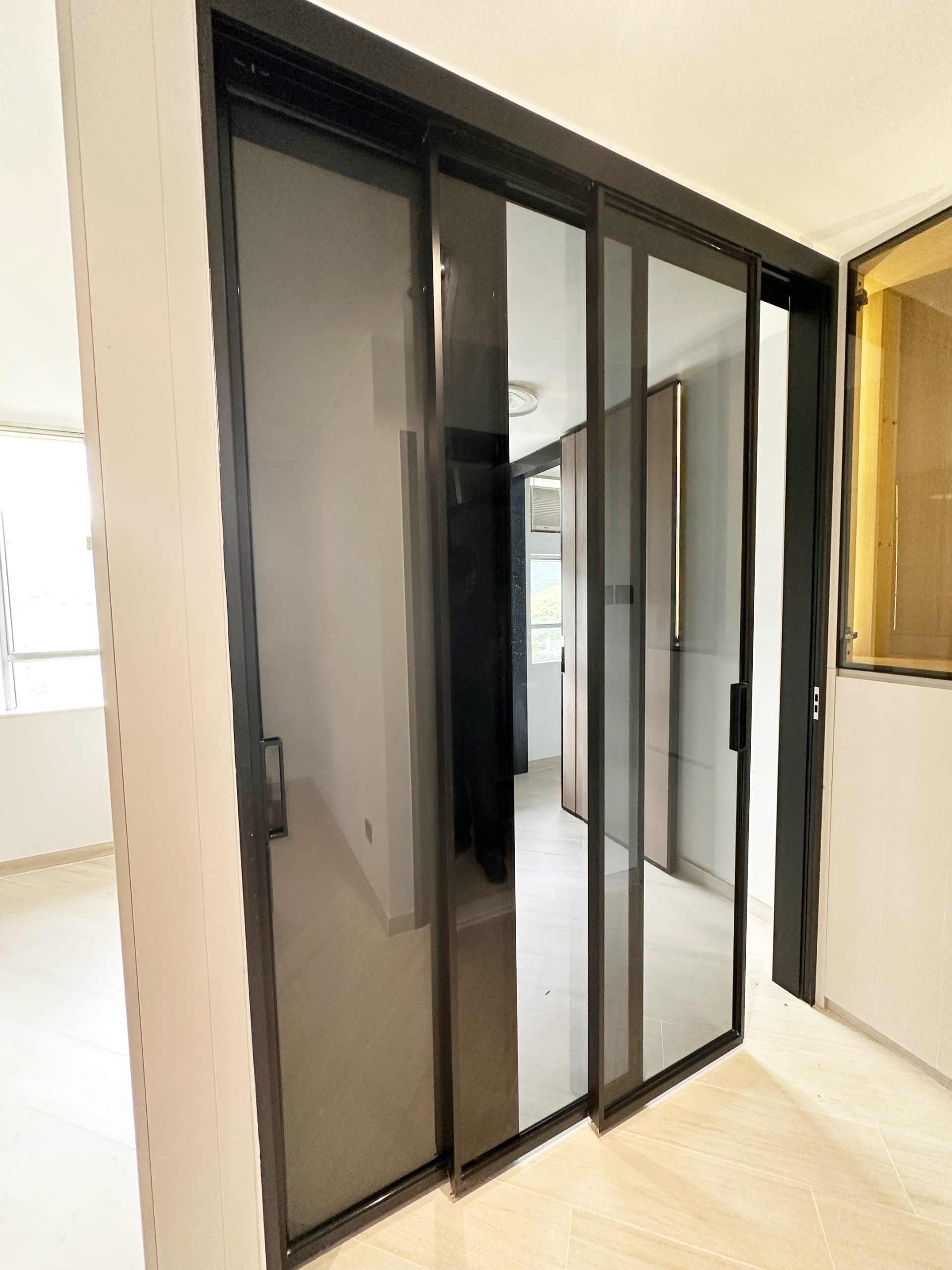 黑色玻璃趟門既時尚又實用。穿過趟門後延伸出一排長間隔櫃,大大增加了儲物靈活性。不僅提升生活舒適度,更成功融入現代極簡風格。