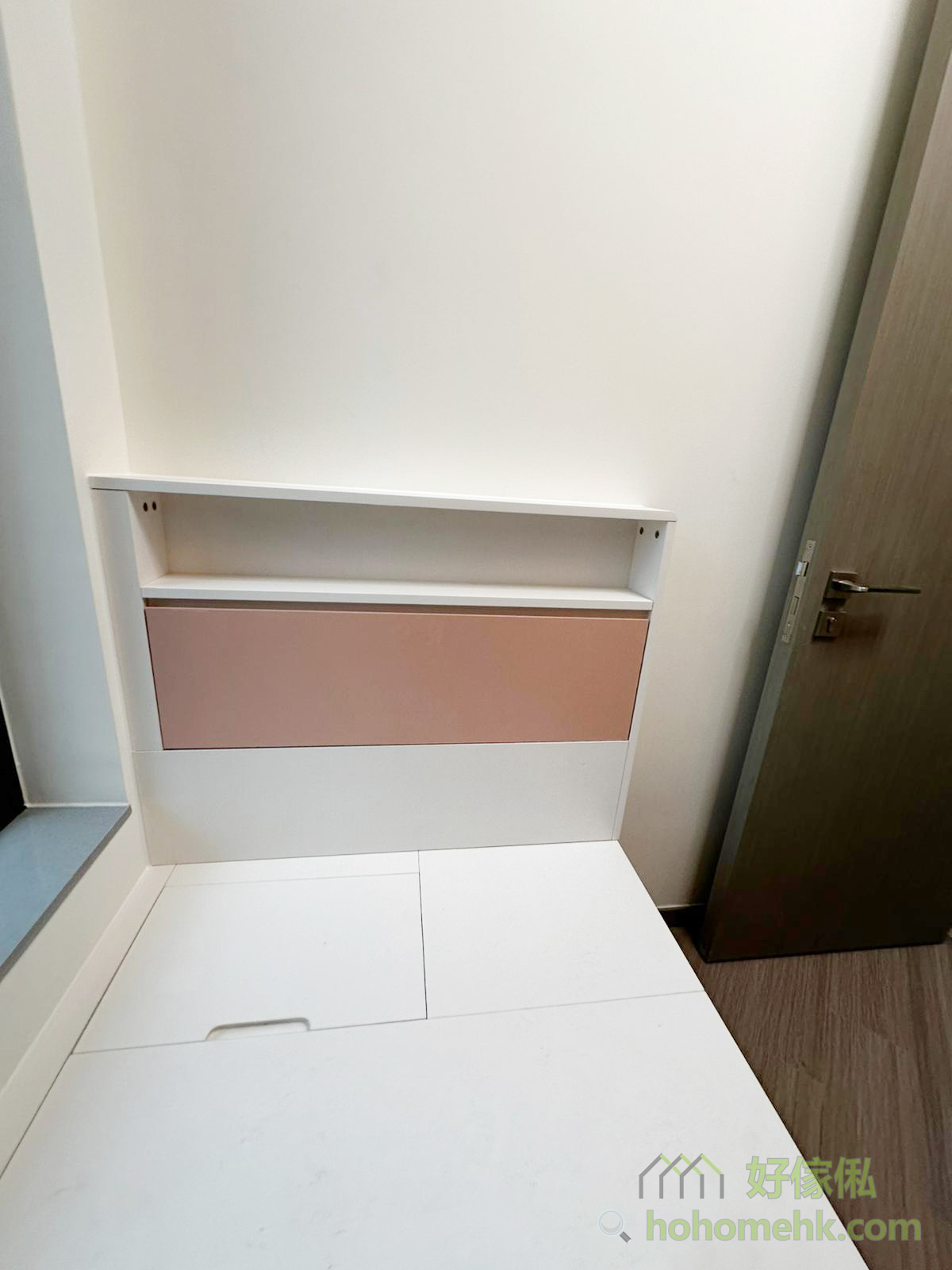 組合床的下層設計充分利用細節空間,加入了薄型床頭櫃。這個貼心的小櫃子讓住戶可輕鬆收納手機、書本或其他日常小物,方便取用。這樣的設計不只是空間利用的極致表現,更帶來居家的便利。