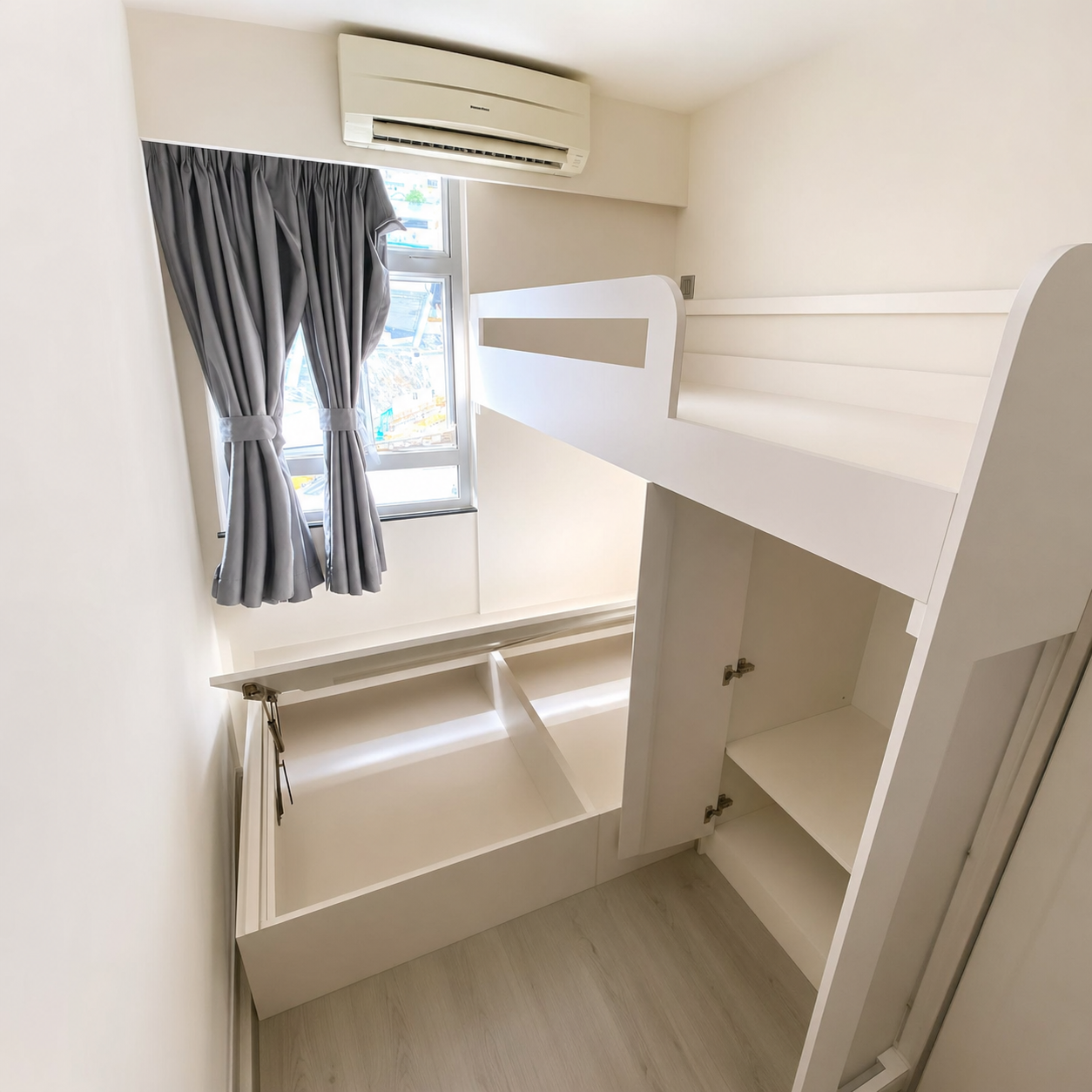 想做組合床但又想用盡窗台的空間,我們有一個方法,就是做成L形床,上格床的床尾可以伸入窗枱的上方,用盡窗台的空間。上格床伸了入窗台後房間自然多了位置,這時就可以打橫做一個到頂衣櫃了,正正因為上格床伸了入窗台,衣櫃的寬度比原來只是做普通的上下床或L形床時大大增加。上格床的下方同時可以做一個趟門衣櫃。一個床下衣櫃,一個到頂衣櫃,再多的衣物都可以在房間輕鬆收納。這就是訂造傢俬的好處。