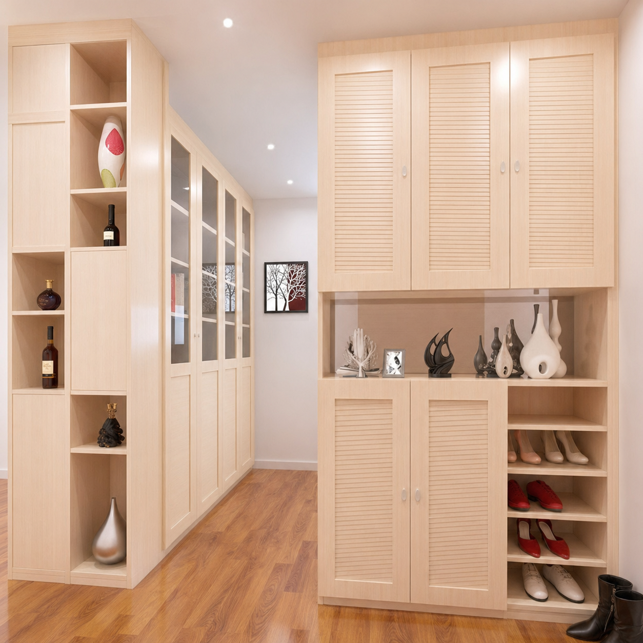 玄關櫃以簡約設計為主,全個櫃身都是原木色,與睡房地台和地板的色調呼應