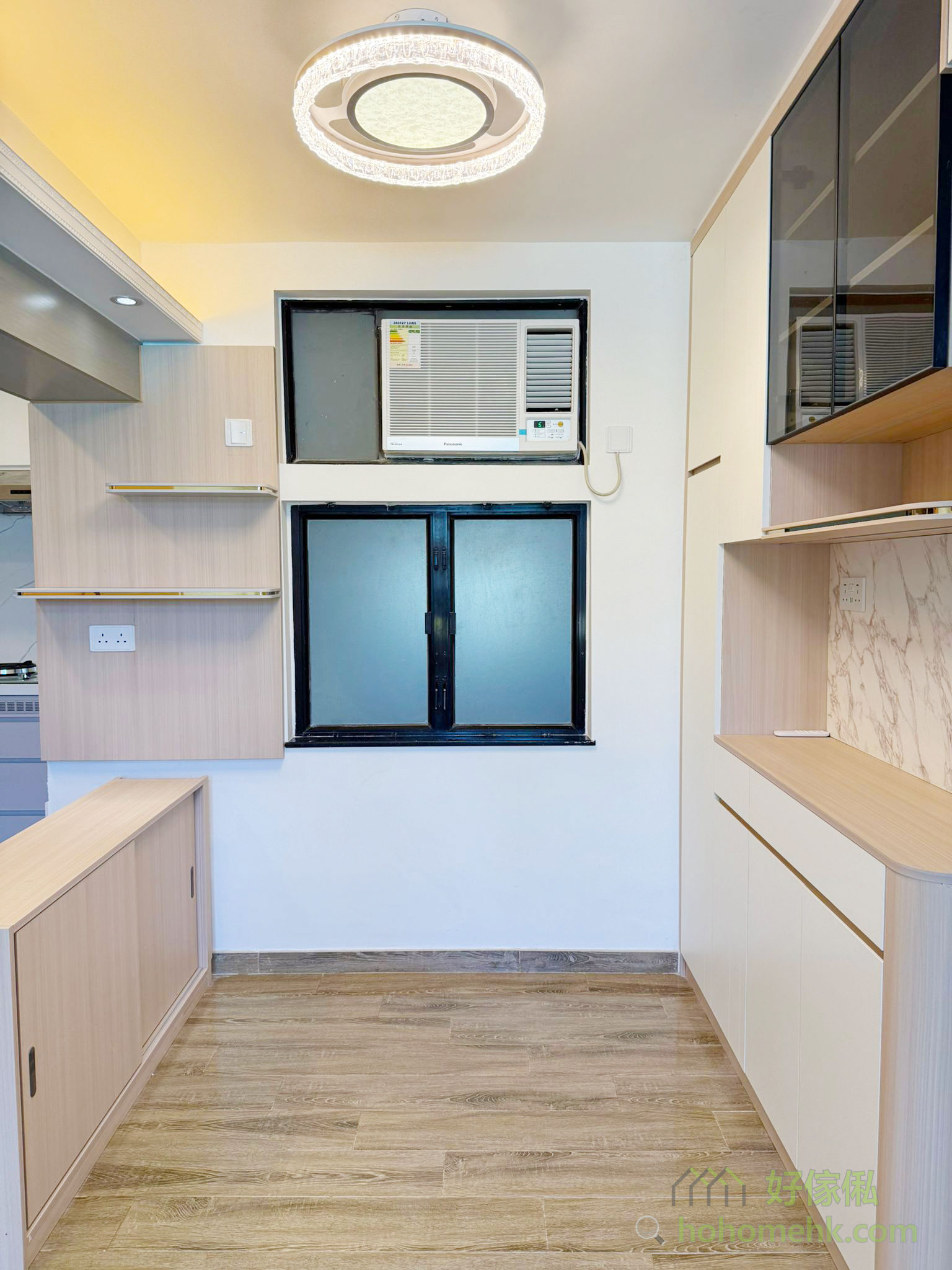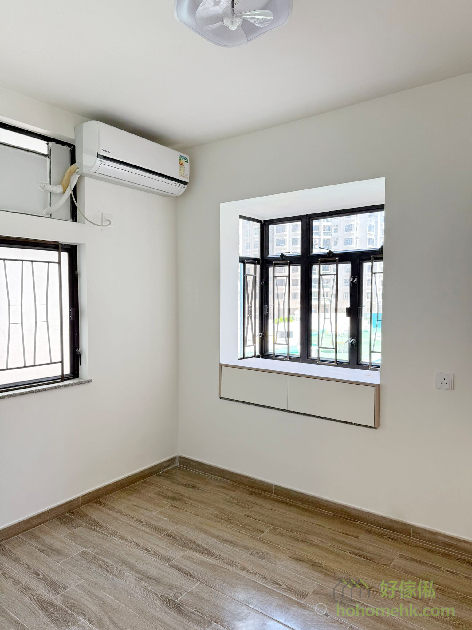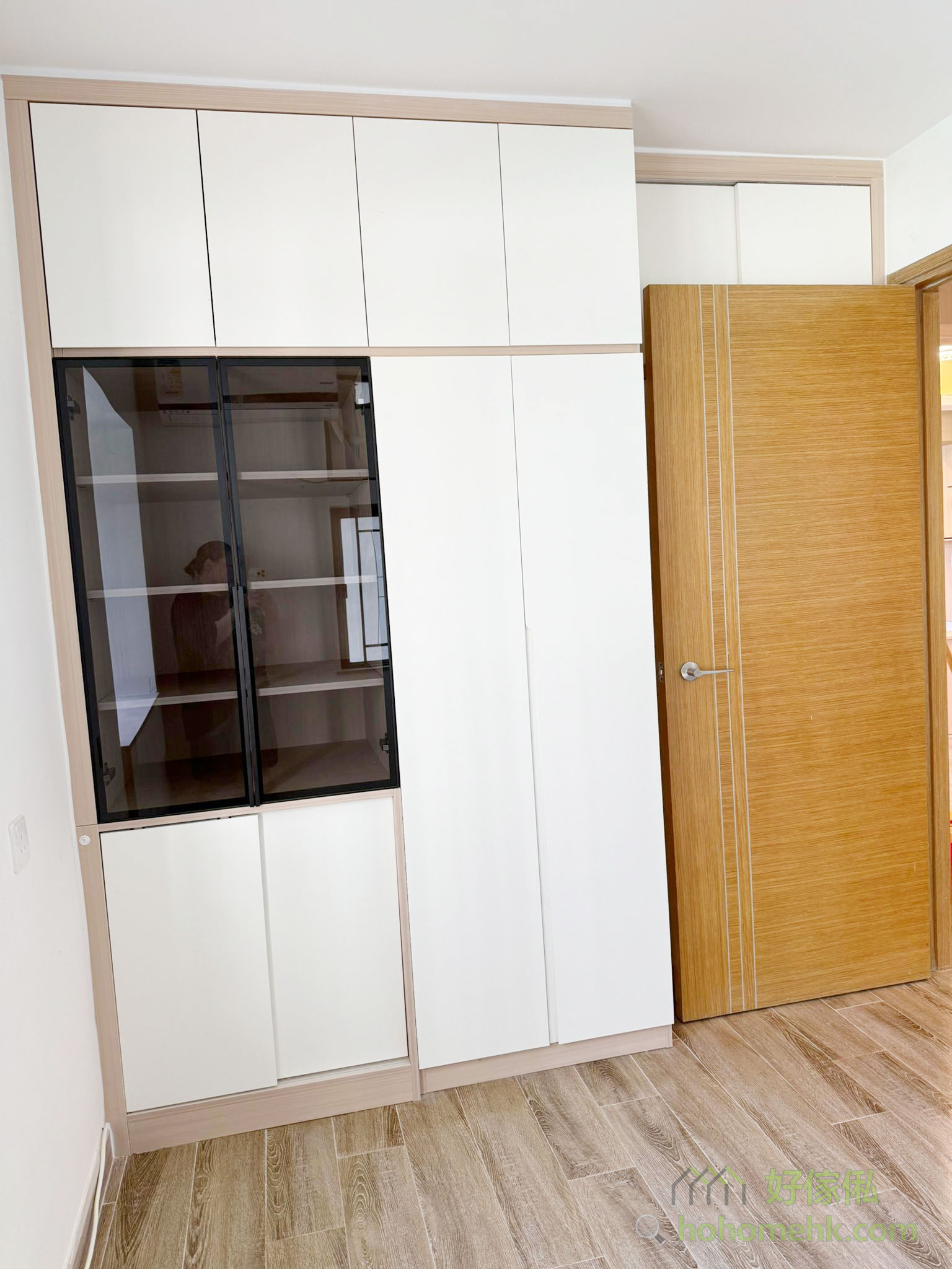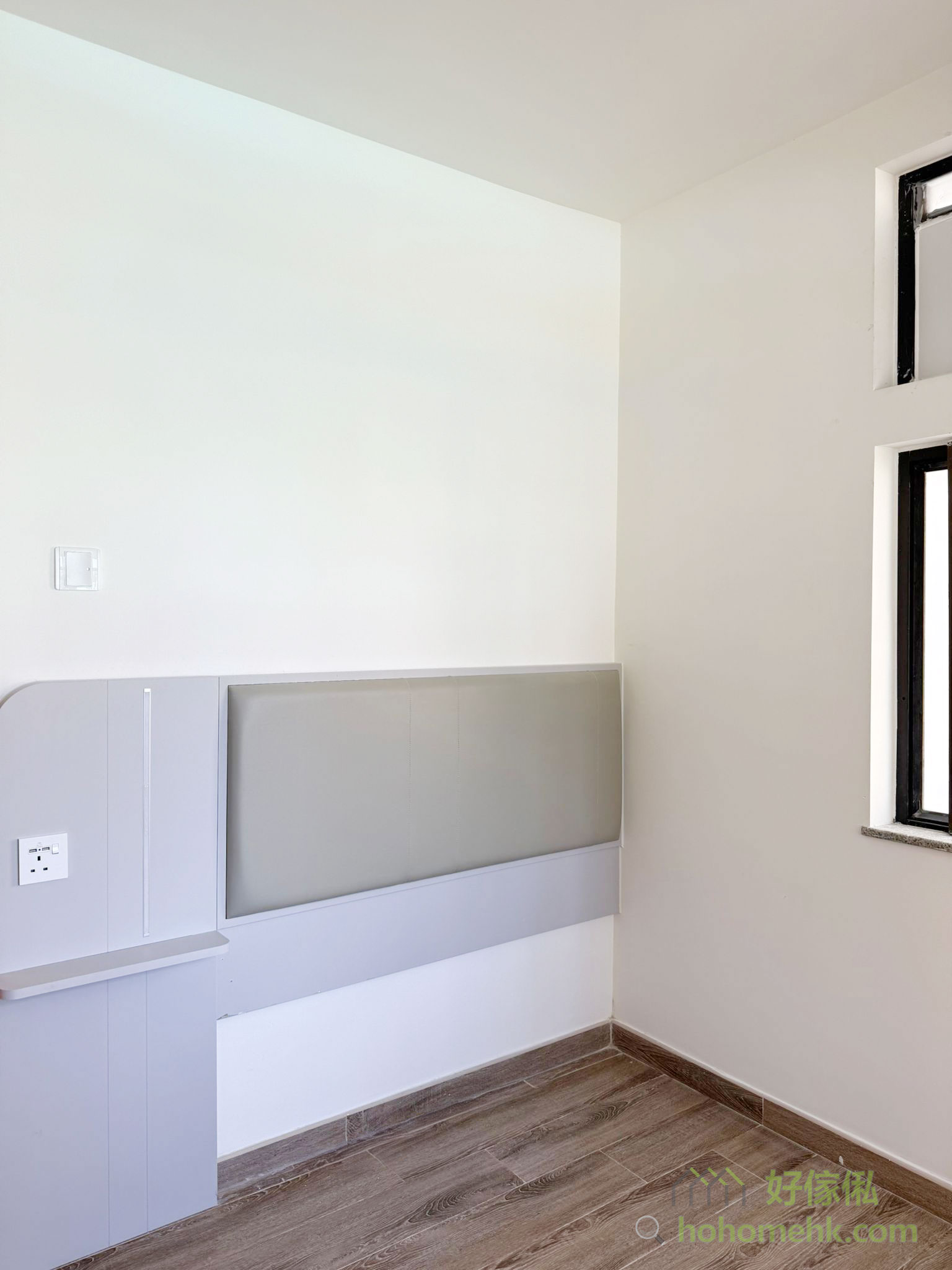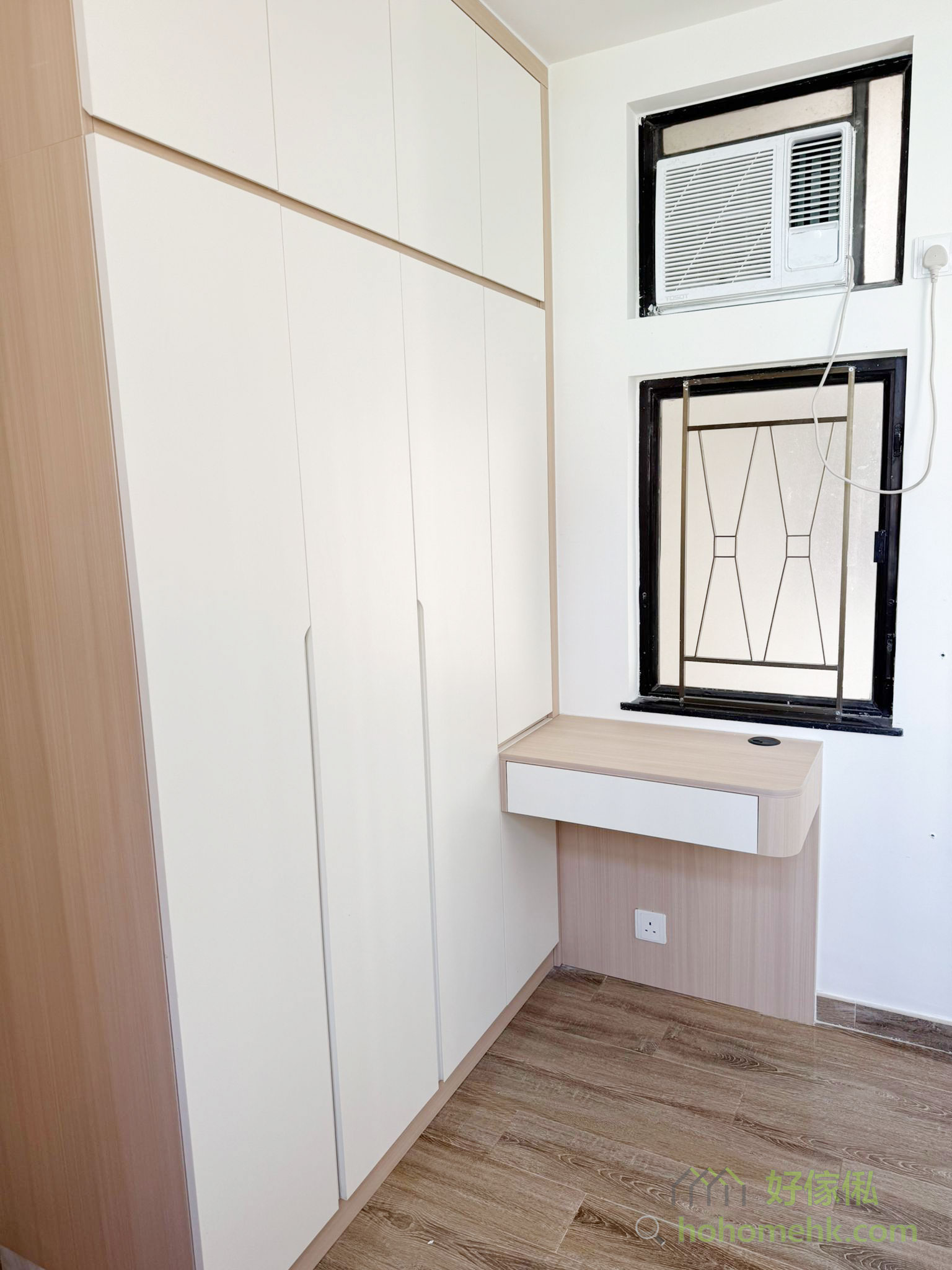 有些客戶對舊傢俬有深厚感情,這次客戶選擇保留原有的床箱,但就沒有床頭板,影響整體美觀和功能性。我們特意為客戶設計了一款全新床頭板,既提升了睡房的設計感,亦完美配合床箱的尺寸及風格,讓舊物重現新價值。另外,衣櫃及半腰櫃就是全新訂造,可以完全用盡所有空間。
