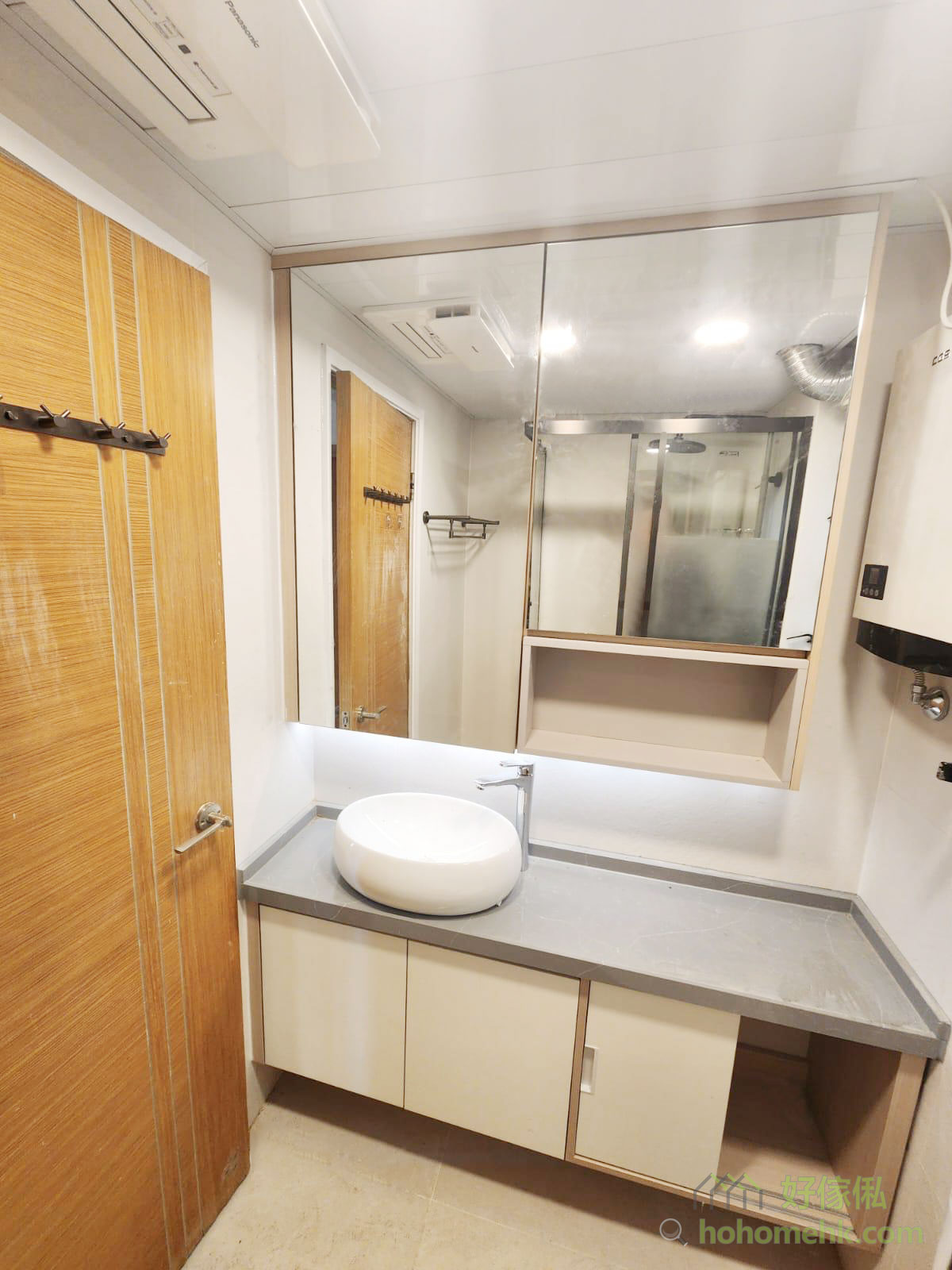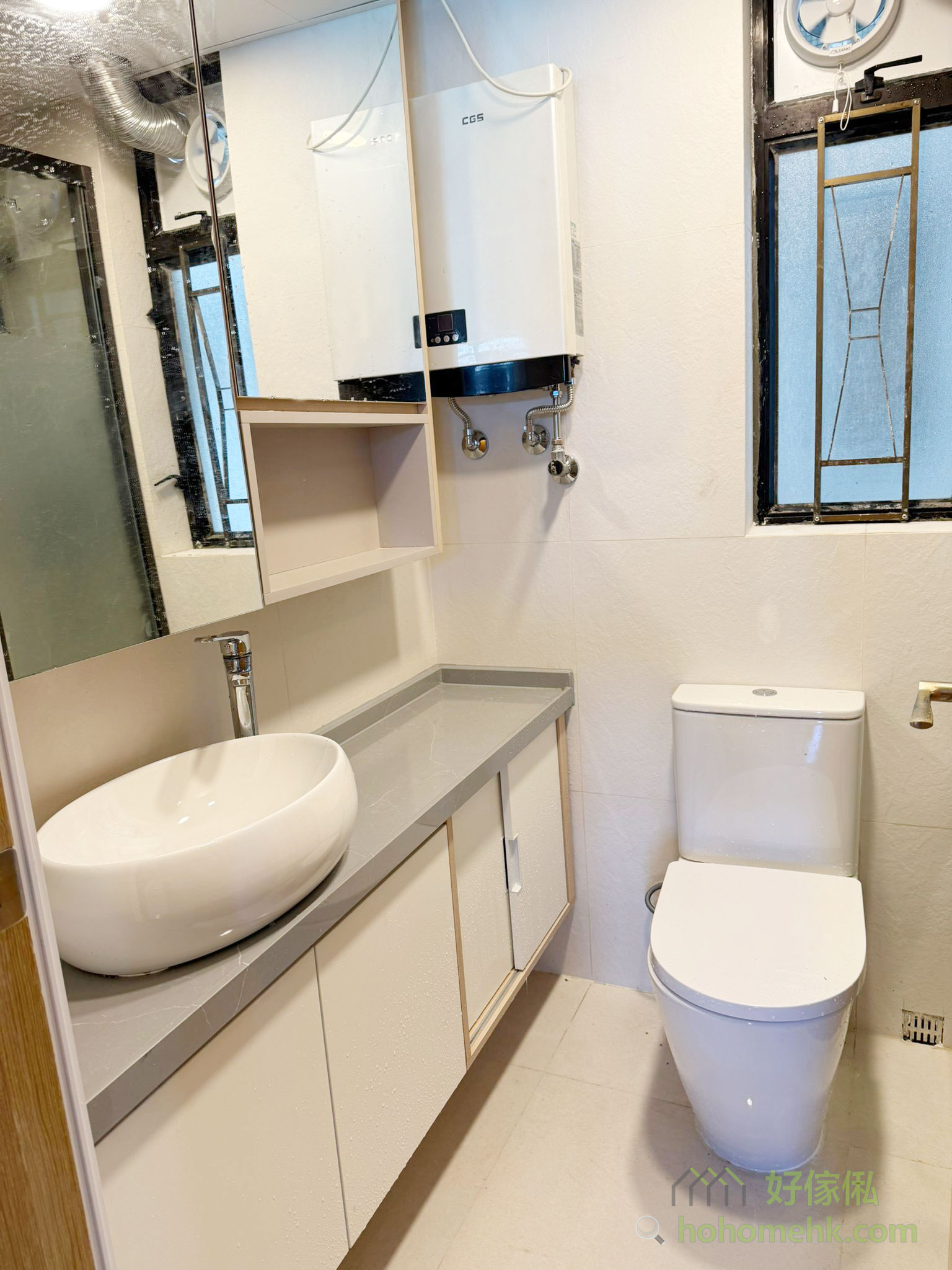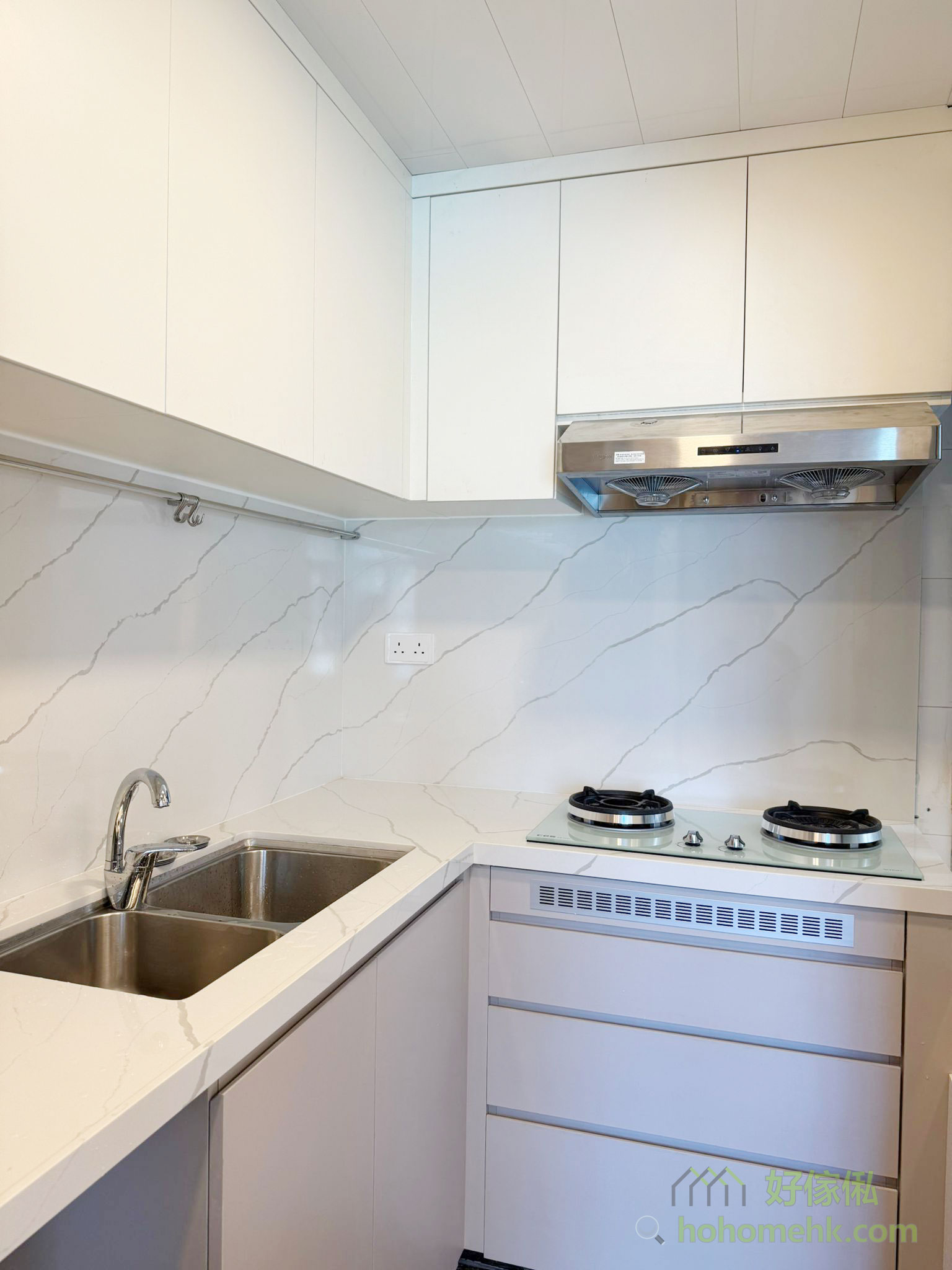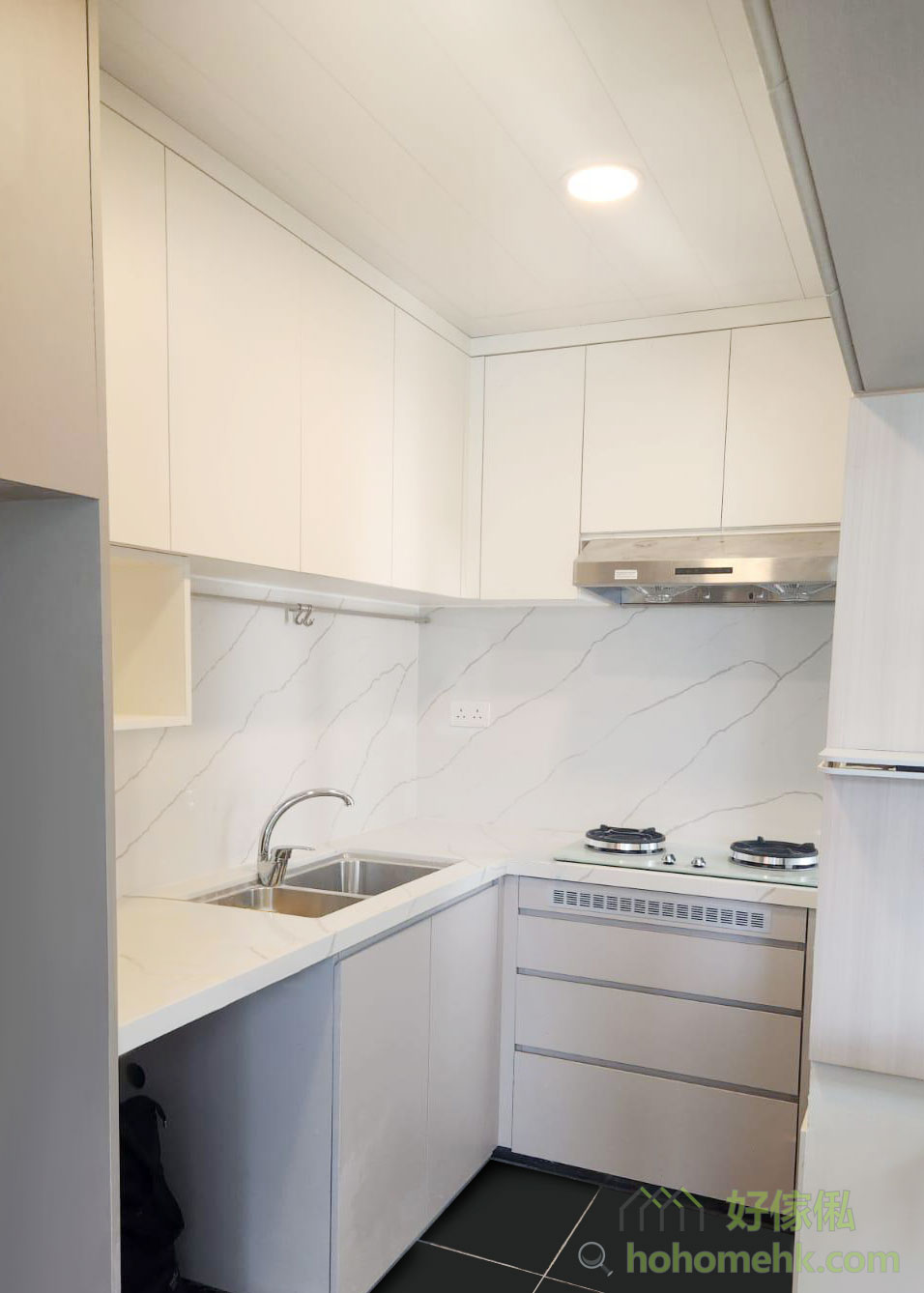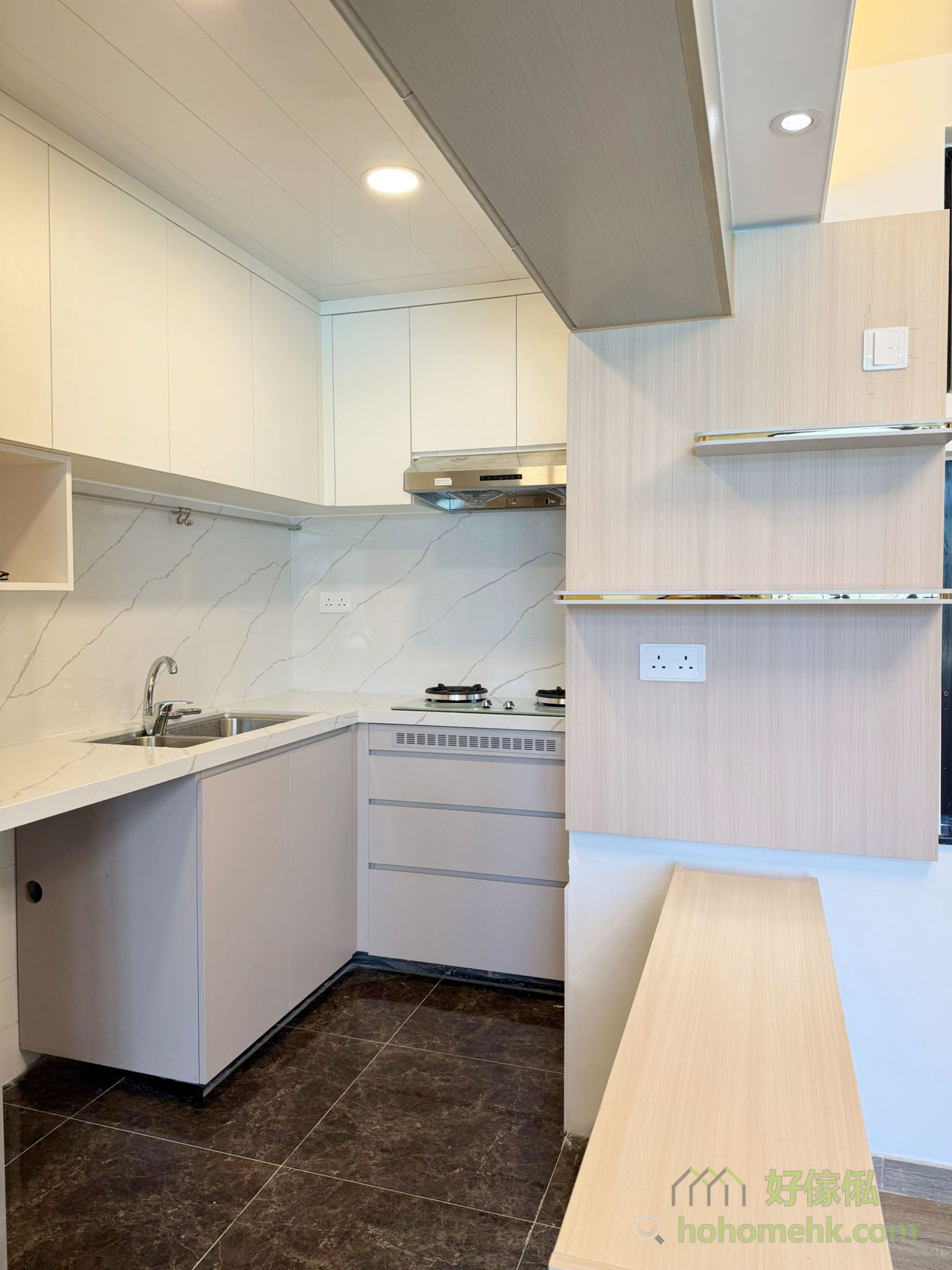 廚櫃、浴室櫃及客廳、睡房的訂造傢俬均採用相同的材質及設計風格,令整個單位的視覺效果顯得更為統一。無論是廚房的潔白牆身,還是浴室的簡約線條,每一件訂造傢俬都體現了細緻的工藝。開放式廚房選擇灰杏色和大面積的奶油色,使整個客廳空間顯得更寬敞光亮。