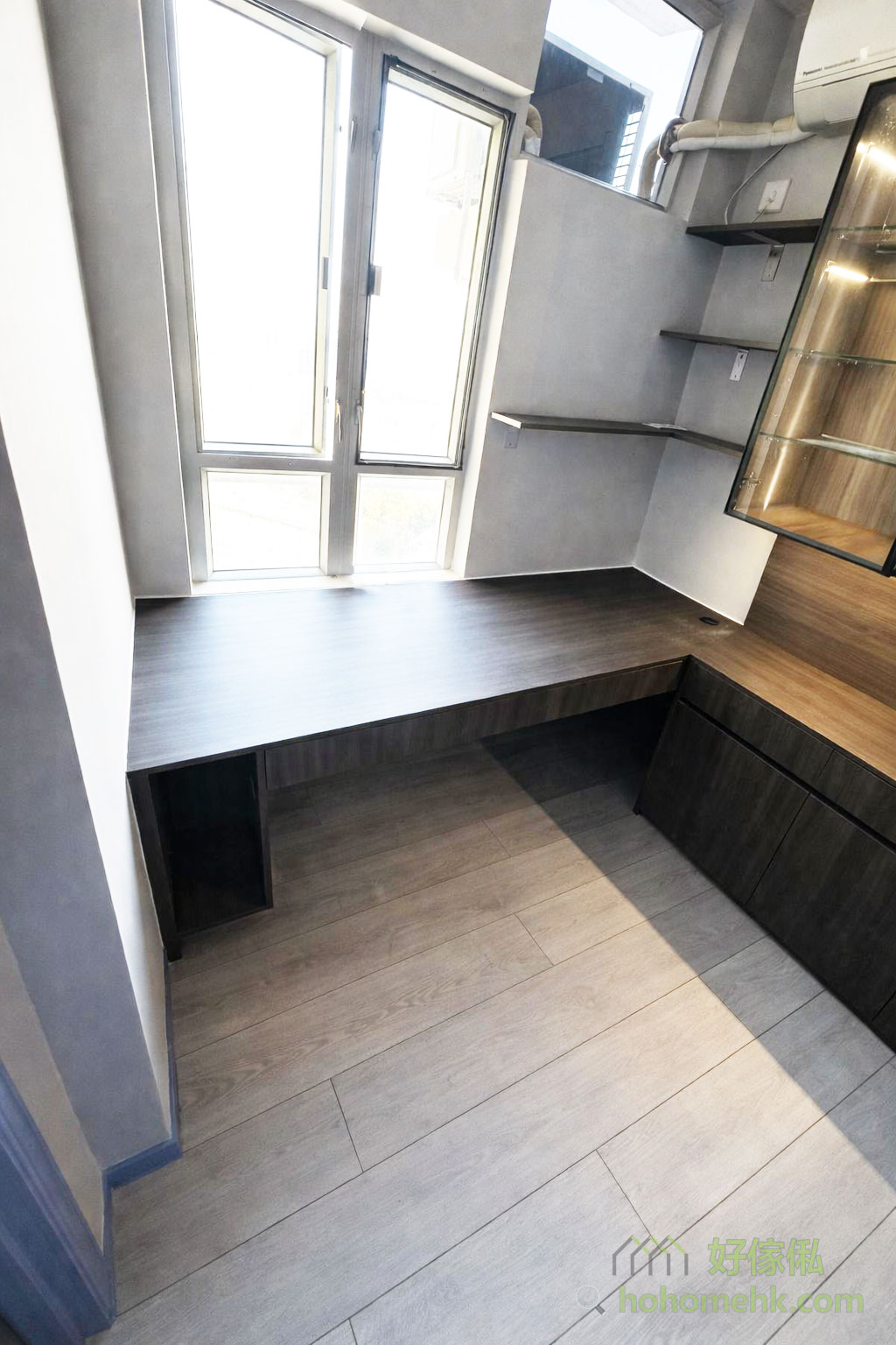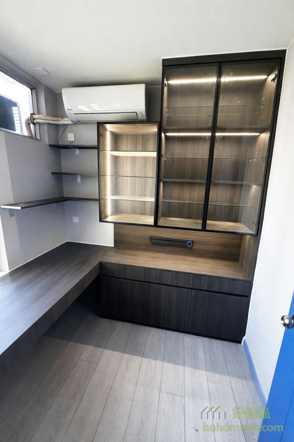 書房中特別訂造了一整排玻璃飾櫃,內置LED燈帶,讓模型公仔得以精美展示,為房間增添個性化的藝術氣息。同時,這些飾櫃亦兼備收納功能,讓書房保持整潔有序,是展示與實用兼備的設計典範。而玻璃飾櫃比層板或開放格更防塵,減少家務量,做到去家務化。