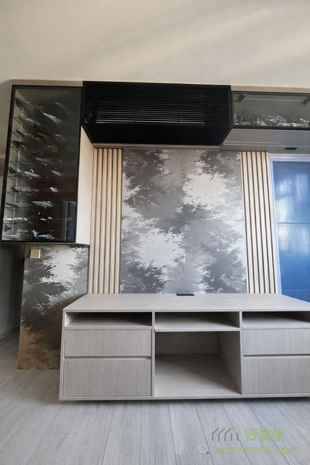暮色系的電視櫃設計以深色為主,背板運用了「月影」色板,增添了一種神秘優雅的氛圍。這種設計與客戶原有的玻璃飾櫃完美融合,既保留了整體空間的和諧美感,又突出了訂造傢俬的獨特風格,是現代型格家居的理想選擇。