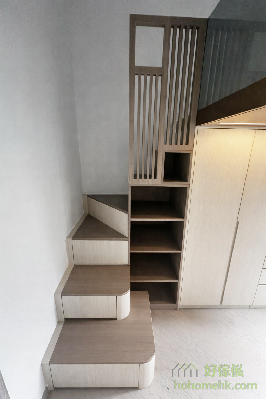 在閣樓設計中,樓梯是至關重要的元素。不僅需要實用,還要兼顧空間感和安全性。大人使用的轉角樓梯櫃設計,可選擇只在上半段安裝扶手,既能保持樓梯簡潔透氣,亦保障使用的安全性。同時,樓梯底部位置更可設計為收納空間,實現多一層的功能化。