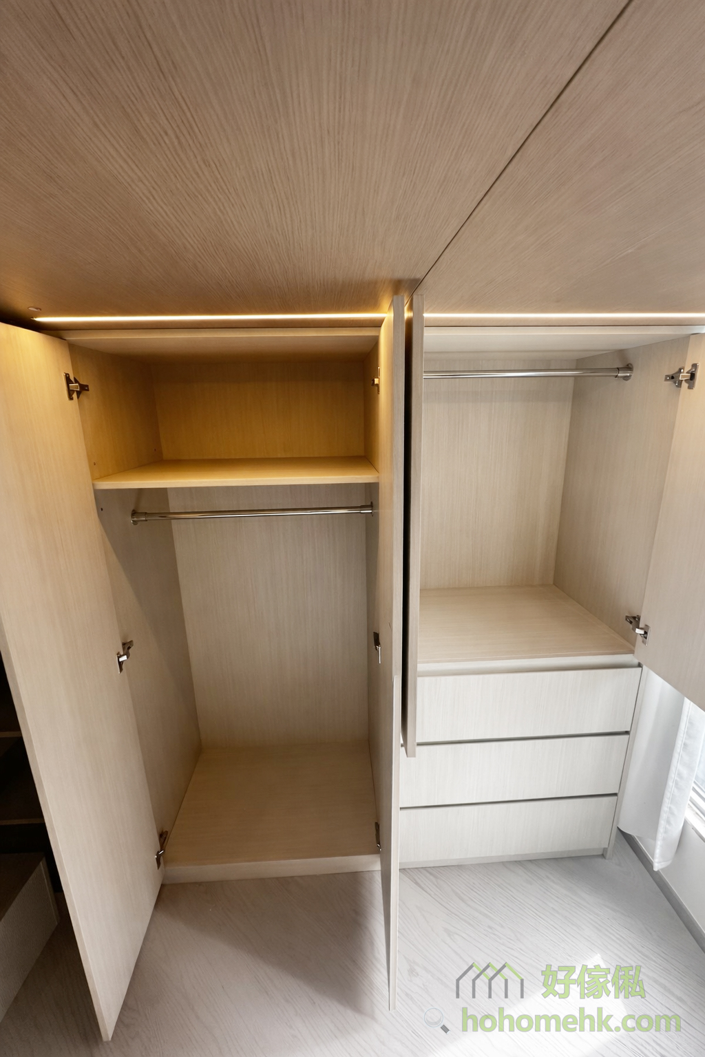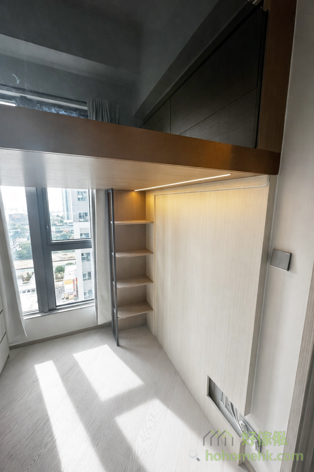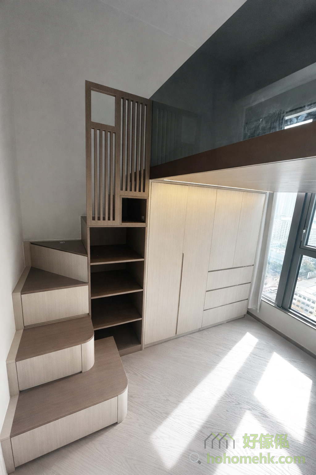 高樓底房間透過訂造大閣樓,可以輕鬆將空間分成上下兩層。上層設為休息區,成為屬於個人的安靜天地,下層則結合大衣櫃和工作、遊戲空間,滿足儲物和生活多功能需求。這類設計不僅優化空間使用率,更提升整體的居住舒適度。